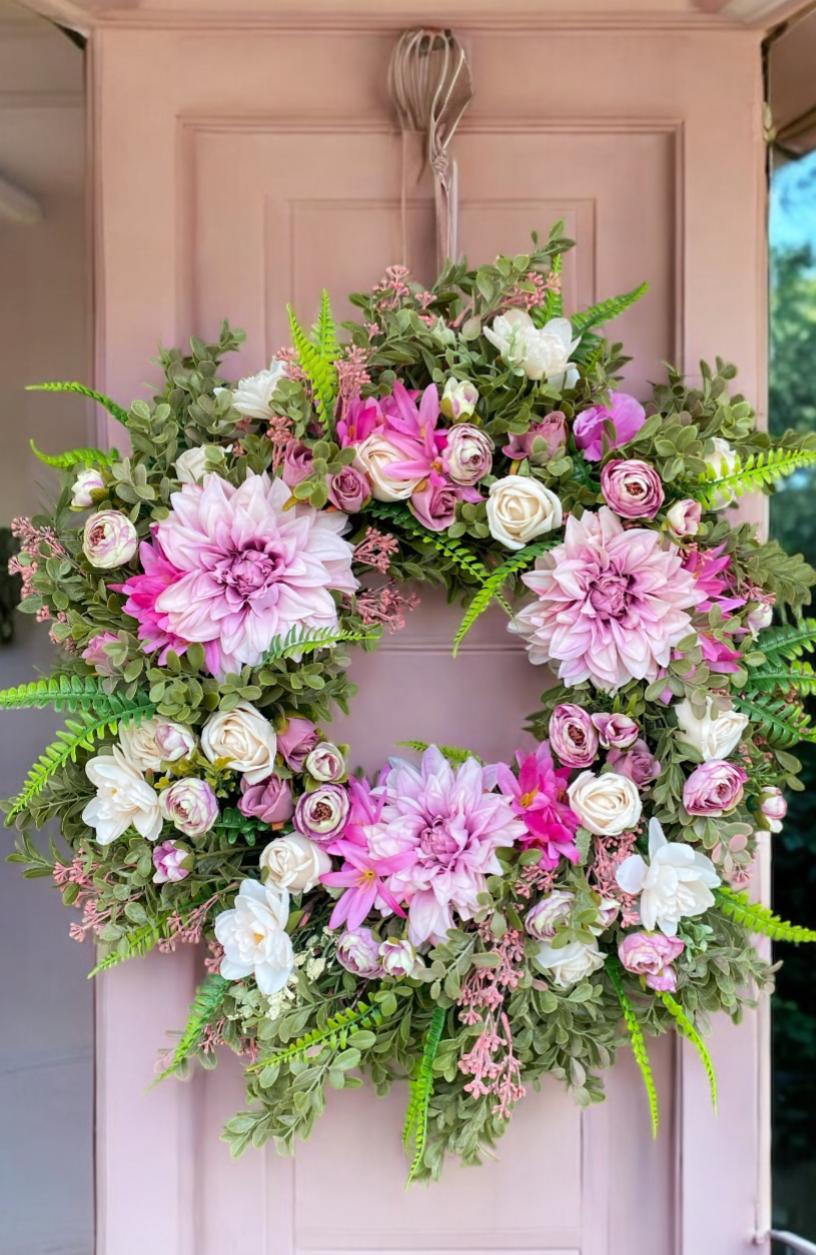 This truly elegant wreath is full & fabulous. A timeless finish with a nice combination of Dusky lavender, pink and cream.