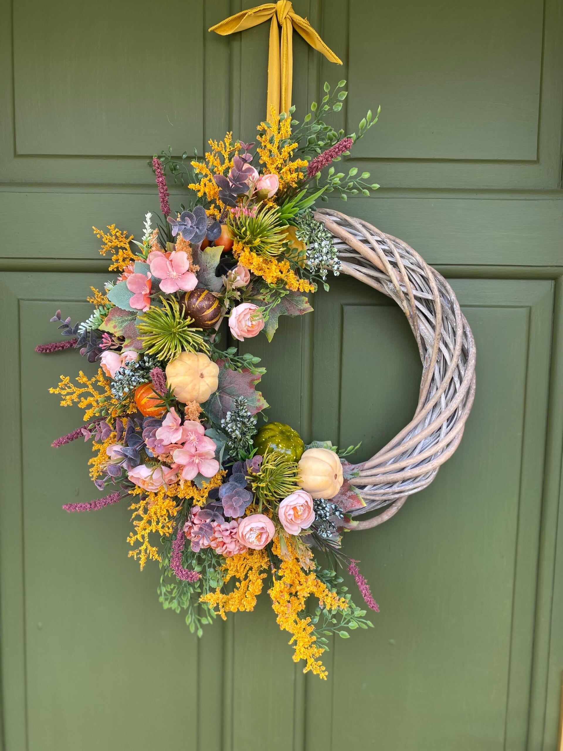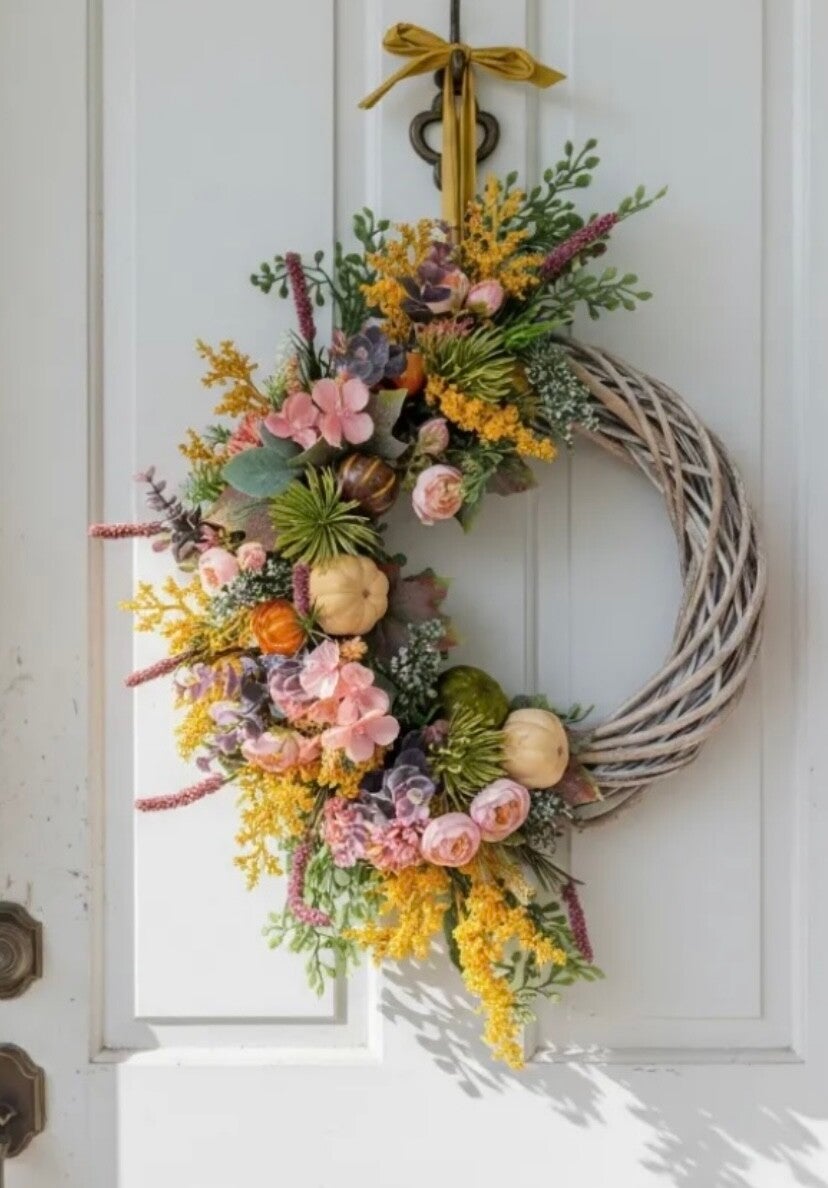 Introducing Molly: A beautiful, balanced autumn wreath. She perfectly blends the season's signature warmth with a sophisticated, gentle palette. Featuring vibrant pops of fiery yellow, the soft elegance of faded peach, and a grounding foundation of lush greenery touched with a deep burgundy.Complete with Yellow/Mustard Velvet Ribbon