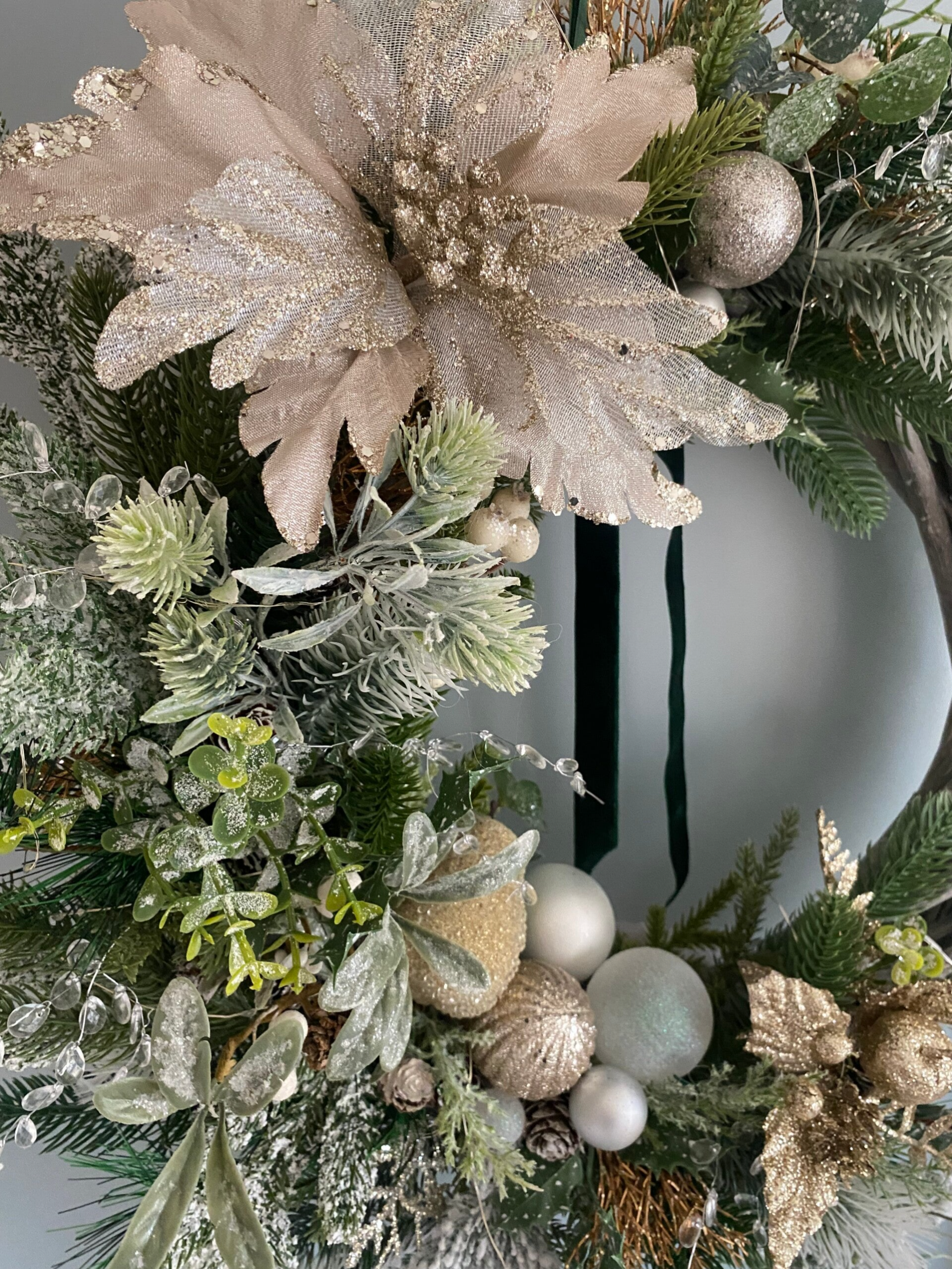 Natural Textures: A generous abundance of various pine needles, real pine cones, and plump, frosted berries create depth and a rich, natural look, finished with a soft Pine coloured Velvet ribbon